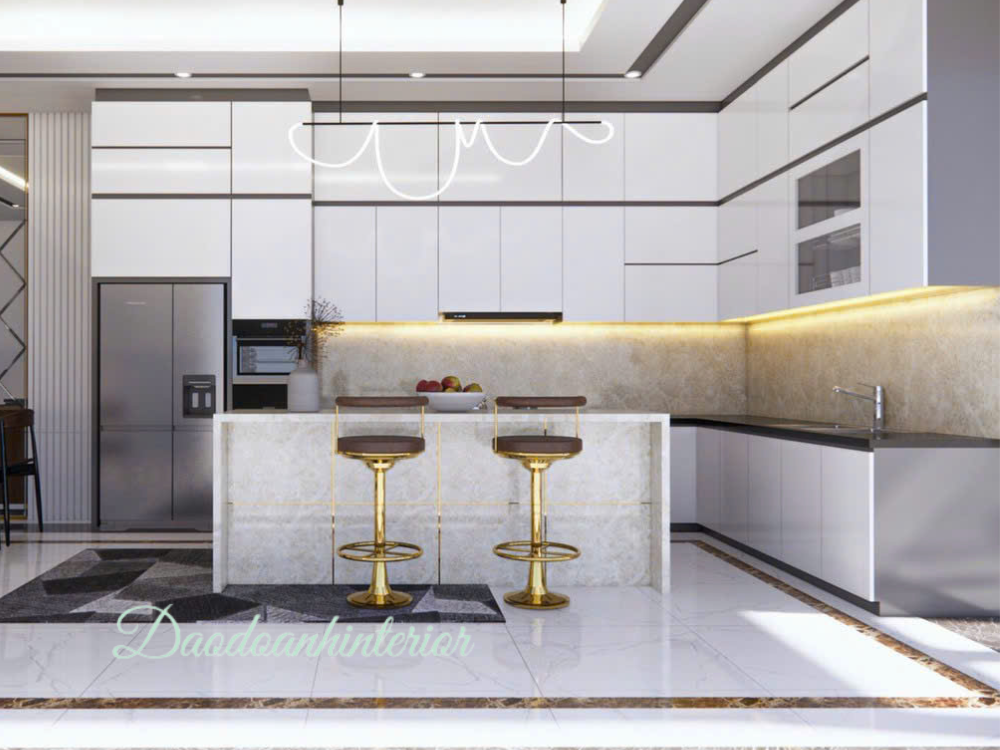 - Bàn đảo bếp tiện ích, có thể sử dụng làm quầy bar mini hoặc không gian chuẩn bị thực phẩm.