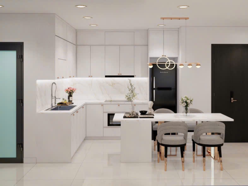 Thiết kế phòng ăn với tủ bếp acrylic màu trắng