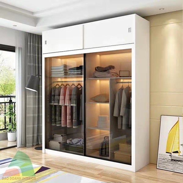 Màu sắc: Khung tủ áo màu trắng Melamine, cánh cửa khung nhôm kính màu trà.