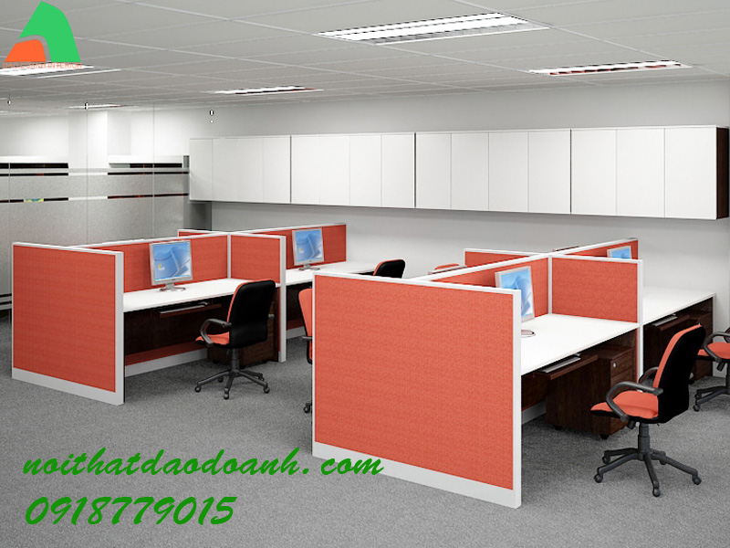 Module Bàn Làm việc BLV01 được thiết kế 4 chỗ ngồi được chia ngăn tạo không gian riêng cho mỗi nhân viên bằng vách ngăn vải bọc nỉ màu đỏ .