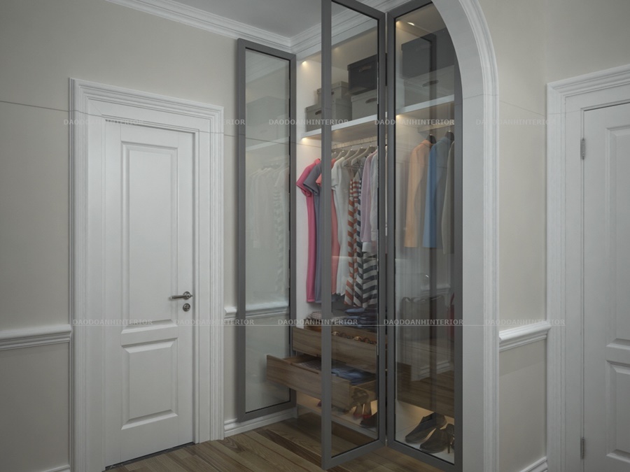 Có thể bố trí tủ nằm gần bàn trang điểm thì sẽ dễ dàng hơn khi vừa chọn trang phục và thay quần áo hằng ngày.